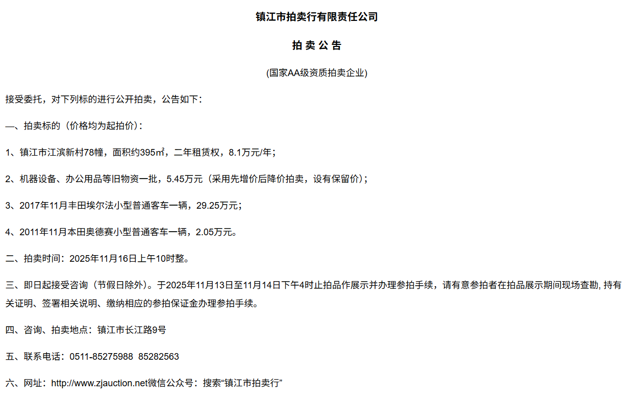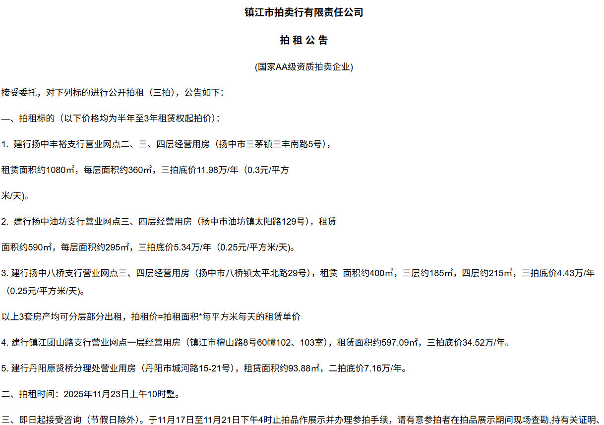 鎮江市拍賣行有限責任公司拍 租 公 吿(國家AA級資質拍賣企業)接受委托,對下列標的進行公開拍租(三拍),公告如下:—、拍租標的(以下價格均為半年至3年租賃權起拍價):1.  建行揚中豐裕支行營業網點二、三、四層經營用房(揚中市三茅鎮三豐南路5號),租賃面積約1080㎡,每層面積約360㎡,三拍底價11.98萬/年(0.3元/平方米/天)。2.  建行揚中油坊支行營業網點三、四層經營用房(揚中市油坊鎮太陽路129號),租賃面積約590㎡,每層面積約295㎡,三拍底價5.34萬/年(0.25元/平方米/天)。3. 建行揚中八橋支行營業網點三、四層經營用房(揚中市八橋鎮太平北路29號),租賃  面積約400㎡,三層約185㎡,四層約215㎡,三拍底價4.43萬/年(0.25元/平方米/天)。以上3套房產均可分層部分出租,拍租價=拍租面積*每平方米每天的租賃單價4. 建行鎮江團山路支行營業網點一層經營用房(鎮江市檀山路8號60幢102、103室),租賃面積約597.09㎡,三拍底價34.52萬/年。5. 建行丹陽原賢橋分理處營業用房(丹陽市城河路15-21號),租賃面積約93.88㎡,二拍底價7.16萬/年。二、拍租時間:2025年11月23日上午10時整。三、即日起接受咨詢(節假日除外)。于11月17日至11月21日下午4時止拍品作展示并辦理參拍手續,請有意參拍者在拍品展示期間現場查勘,持有關證明、簽署相關說明、繳納相應的參拍保證金辦理參拍手續。四、咨詢、拍租地點:鎮江市長江路9號五、聯系方式:0511-85275988   13655299933楊先生六、網址:http://www_zjauction_net.ufsb.cn;微信公眾號:搜索“鎮江市拍賣行” 拍品清單2025.11.23序號名稱起拍價(元)標的說明1建行揚中豐裕支行營業網點二、三、四層經營用房(揚中市三茅鎮三豐南路5號),租賃面積約1080㎡,每層面積約360㎡三拍底價11.98萬/年(0.3元/平方米/天)1、1-3號房產均可分層部分出租,拍租價=拍租面積*每平方米每天的租賃單價;2、意向競拍人在拍賣前需持營業執照或身份證與委托方說明租賃房產經營業態,確定意向后出具房產承租用途承諾書,經委托方審核后,方可交納保證金參加競拍;3、租賃期限為半年至3年(承租方與出租方協商而定),承租方每半年或一年結付租金,租賃期間的水、電費用及其它相關費用均由承租方承擔;4、承租方不得用于經營和保管危險物品,不得用于開設餐飲、娛樂等可能嚴重影響消防安全、運營安全的經營業態,不得用于經營委托貸款、小額貸款等可能冒用委托方名義,帶來聲譽風險的經營業態。租賃期內,承租方不得破壞墻體結構,自行成就消防、安全等使用條件,不得擅自將租賃房屋轉租、轉讓給他人使用,否則委托方有權收回房屋;5、拍租成交后,承租方將租金交至出租方指定賬戶,傭金交至拍賣方賬戶(拍租傭金為該房屋一個月租金)。承租方憑租賃合同無息退還保證金。2建行揚中油坊支行營業網點三、四層經營用房(揚中市油坊鎮太陽路129號),租賃面積約590㎡,每層面積約295㎡三拍底價5.34萬/年(0.25元/平方米/天)3建行揚中八橋支行營業網點三、四層經營用房(揚中市八橋鎮太平北路29號),租賃面積約490㎡,每層面積約245㎡三拍底價4.43萬/年(0.25元/平方米/天)4建行鎮江團山路支行營業網點一層經營用房(鎮江市檀山路8號60幢102、103室),建筑面積約597.09㎡三拍底價34.52萬/年5建行丹陽原賢橋分理處營業用房(丹陽市城河路15-21號),建筑面積約93.88㎡二拍底價7.16萬/年
